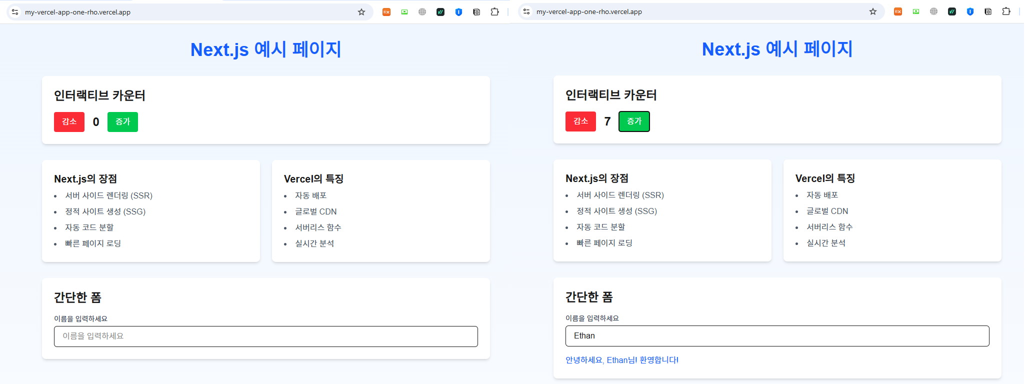 - 폼 입력: 이름을 입력하면 실시간으로 환영 메시지가 표시